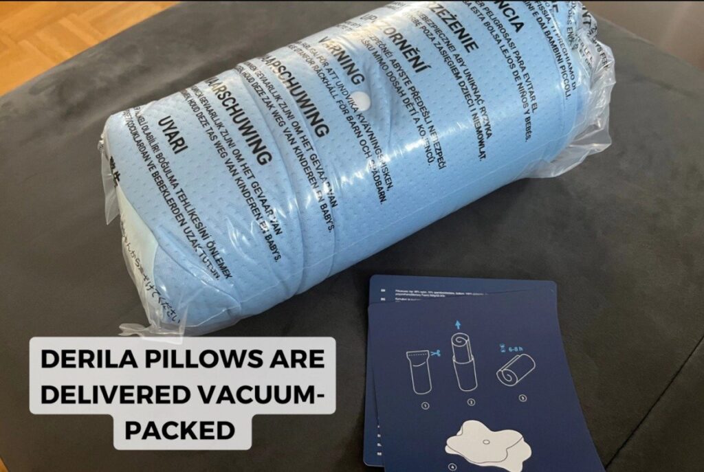 The pillow comes tightly vacuum-packed in a compact box, which is incredibly space-saving.